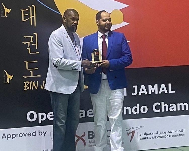 صل حكام دولة الكويت الحكم عبدالرحمن سيار والحكم محمد السناسيري على جائزة افضل حكم في بطولة بن جمال المفتوحة للتايكوندو المقامة في مملكة البحرين
